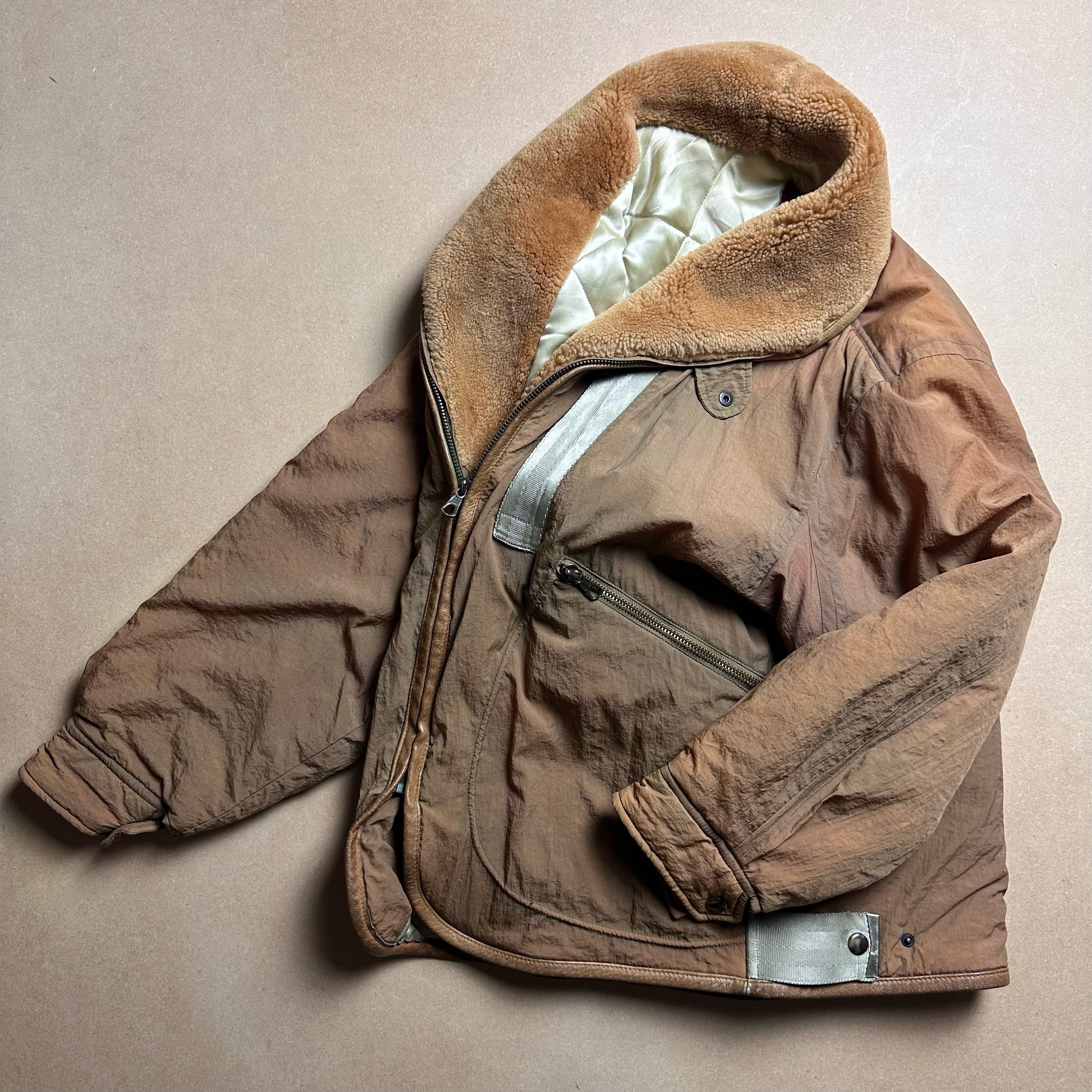 Designed by Massimo Osti. Japanese nylon field jacket with silk quilted lining and a shearling collar. Features hidden vertical stash pockets and two large cargo style zip closure patch pockets. Complete with horn buttons throughout.